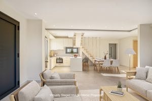 The attic, available in the two end units, includes a multipurpose space suitable as a living room, office, or additional bedroom, along with a private bathroom. The main living area of each home is designed as a unified open space combining kitchen, dining, and living room.