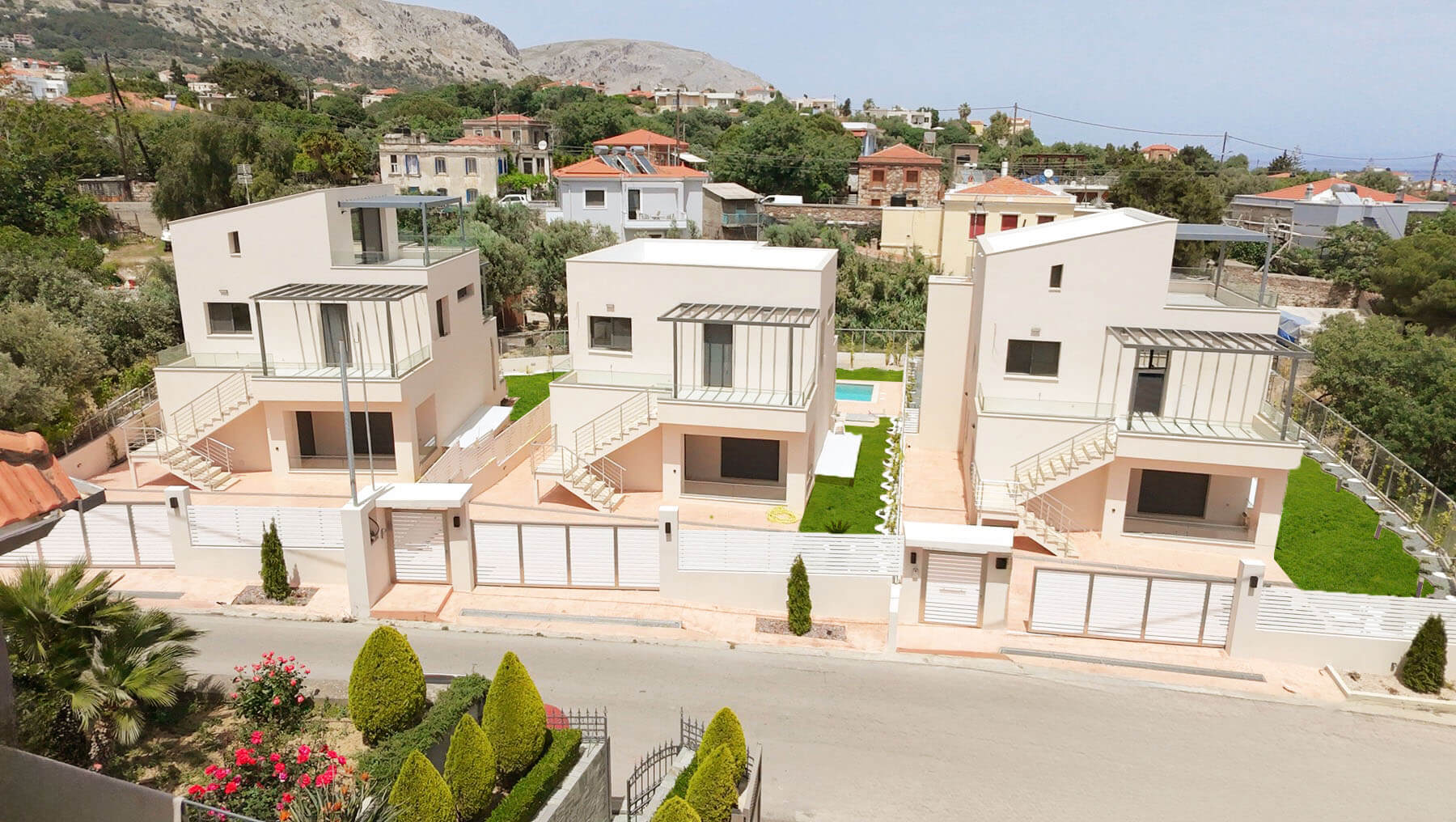 The three maisonettes are set on plots of 444.33 sq.m, 456.51 sq.m, and 617.81 sq.m, with interior spaces of 281.18 sq.m, 246.13 sq.m, and 300.34 sq.m respectively. The two larger residences are spread over four levels and include four bathrooms and one WC. The middle residence, which does not feature an attic, includes one bathroom less.